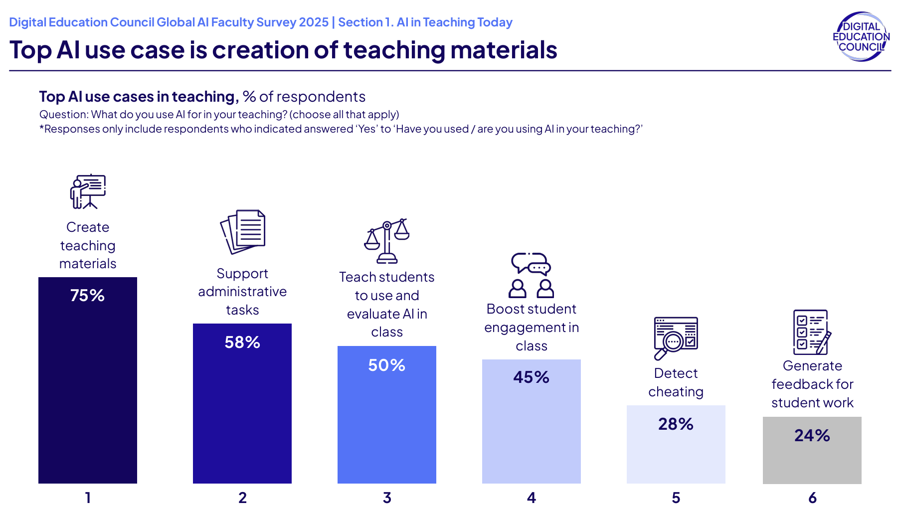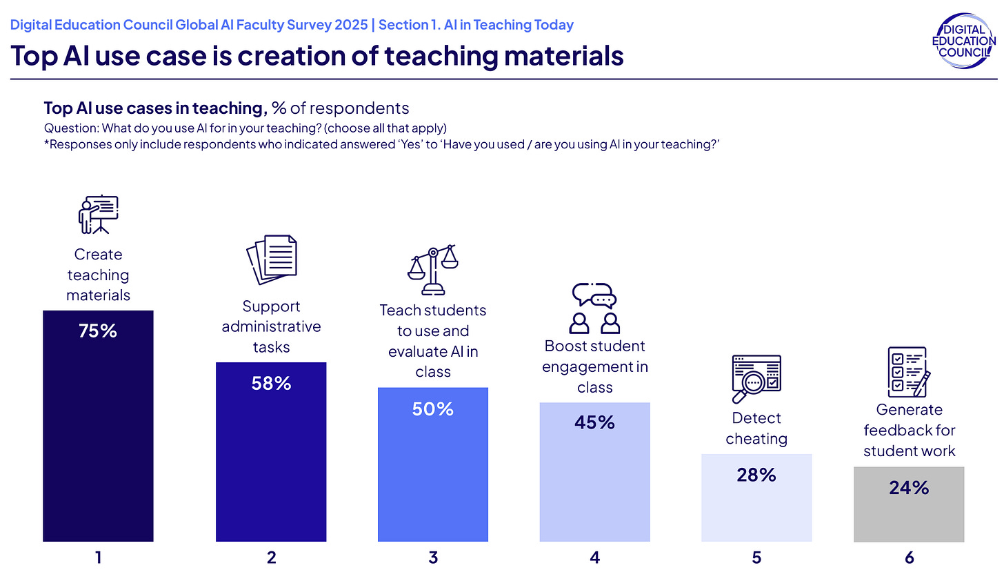 Faculty are already using AI in many ways to help save themselves time and to save their institutions money. According to the Digital Education Council Global AI Faculty Survey 2025, the most common use case for faculty using AI is in creating teaching materials. Using AI to help create course materials saves faculty time which can be spent on higher value interactions with students, and also enables these course materials to be easily personalise to their specific courses. The graph below shows the top 6 use cases of AI by HE Faculty according to the DEC survey.